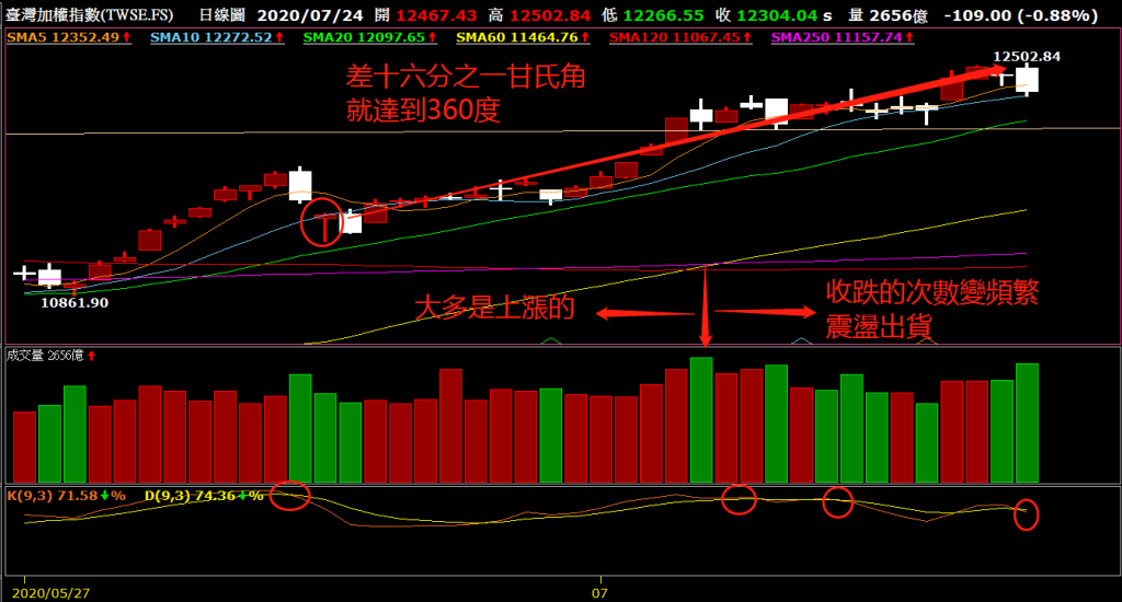 就甘氏角度的觀點,24日加權指數盤中的12502高點等於挑戰12520點壓力失敗,最低拉回到12266.55點,等於守住12250點關卡,行情再一次退守12250點,代表12250點這道關卡重要,一旦行情發生突破,必然是單邊大行情,因此如果「12340~12170點的八分之一甘氏角空間」被打破的話,可能就是單邊行情的訊號。下周盤勢進入關鍵周,鎖定Line@邏輯博弈教室更新最新觀點分享。