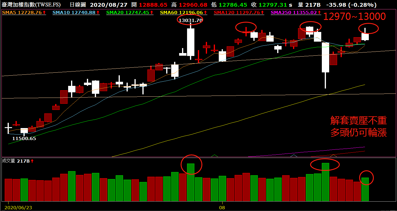 盤後共20支漲停板,只有3支高價股,處在13000點的歷史高點附近,市場保守心態造成低價股成為盤面的避風港,但卻又不是純投機的炒作,因為半年報的公佈,讓第二季就賺贏去年全年的轉機成長股,得到基本面派的認同,漲的理直氣壯,遠距離辦公教學視訊軟體的圓展再創波段新高,高舉轉機成長的大旗,激勵倉和的除權秀以漲停板做收,宣德、貿聯-KY創波段新高,就連近期關注的合勤控、安鈦克等也應聲漲停。這股低價股的鹹魚翻身行情還會持續一段時間,至少在iPhone12亮相之前,市場除了綠能與台積電概念股之外,缺乏更亮眼的主軸,因此繼續鎖定轉機股的投資機會。