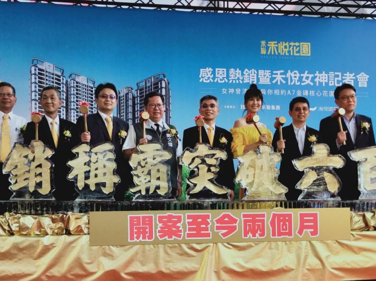「禾悅花園」占地4720坪,共計5棟29層摩天建築,約有上千戶的大型社區,每坪開價約26-28萬元;「禾聯集團」董事長蔡金土(右4)與桃園市長鄭文燦(左4)於8月29日,共同為熱銷六成進行破冰儀式。