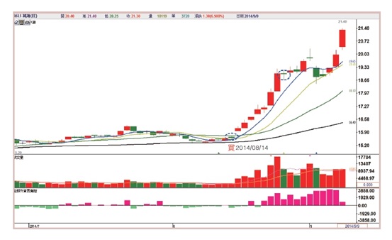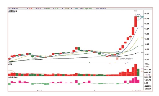 我有一位朋友,他是專業投資人,很會選股,選的股票多半會上漲,他隨時有一百多檔股票名單在觀察,檯面上熱門的股票、業績成長的股票,都在他的觀察名單內。航運股萬海(2615)是他鎖定的標的物,他在行情發動前2014年8月14 日就以15.5 元買進,他早外資三天買進,在他買進第四天,外資開始買進萬海1127 張股票,就這樣萬海在外資買盤湧入之下連漲了五天,將股價推高到19.25 元。以成本價15.5 元計算,七天已經創造了22.6% 的報酬率,每百萬資金為他創造22萬元的獲利,他很滿意這次的操作,在隔天漲不動的時候以18.9 元將股票賣掉。