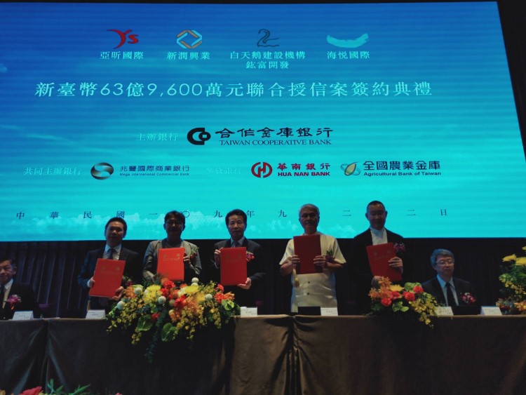 四強聯手的百億大案,9月22日並於林口舉辦63.96億元聯貸簽約典禮,由合庫主辦,新潤興業董事長郭長庚、亞昕國際董事長姚連地、白天鵝機構-鋐富董事長陳清堯、海悅國際董事長黃希文及合庫總經理陳世卿均出席。