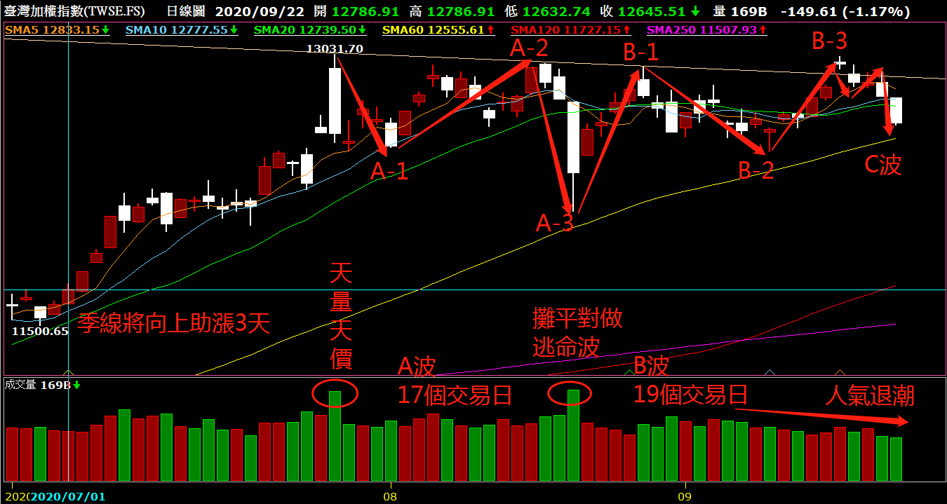 就甘氏角度的觀點,正如昨天所提示的「如果不能突破13080、且跌破12730,就要提防下探12380的可能性」,接下來如果失守12520,則過去8周在12520點之上就成為套牢區,換言之,明天多頭背水一戰,可能會有假跌破季線的拉下影線機會。拉下影線不難,難在無法跨越一日反彈。