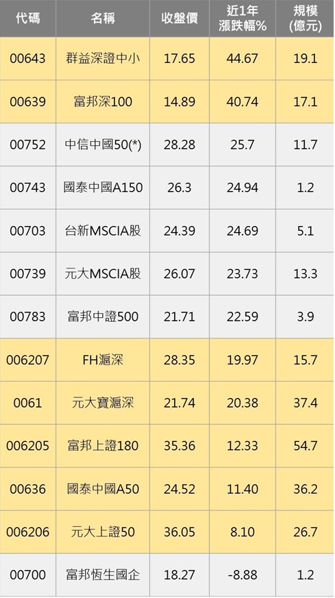 但以在台灣發行的陸股ETF規模來看,卻發現目前是上證指數相關ETF最受歡迎,規模可達20到50億元,其中以富邦上證180規模最大,有54.7億元。但與深圳指數相關ETF,規模則還不到20億元。另外,與自由中國指數、MSCI A股指數相關的ETF,目前規模都還不到15億元,尚未獲得投資人重視。值得提醒的是,有4檔ETF規模在5億元以下,投資人要注意規模太小的風險。
