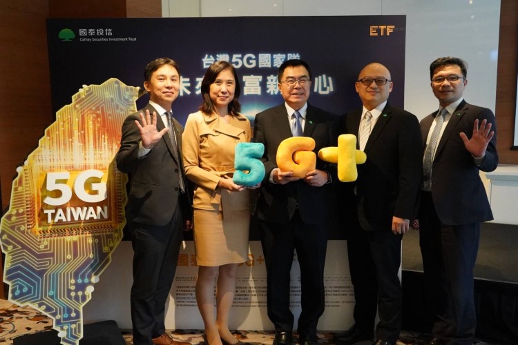 圖片說明:國泰投信發行台灣5G+ETF,總經理張雍川(中)率資深經理游日傑(左起)、資深副總吳惠君、副總經理鄭立程及經理人蘇鼎宇出席記者會。
