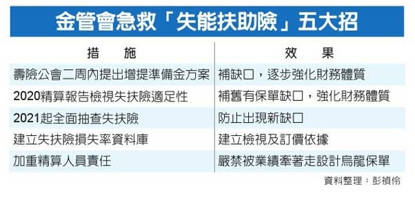 保險局針對失扶險,祭出五大措施助業者「自救」,一是要求壽險公會二周內提出失扶險增提準備金方案;二是2020年簽證精算報告要全面檢視失扶險費率及準備金是否提足;三是2021年起全面抽查失扶險;四為建立失扶險損失率資料庫;五是追究保單精算人員責任。