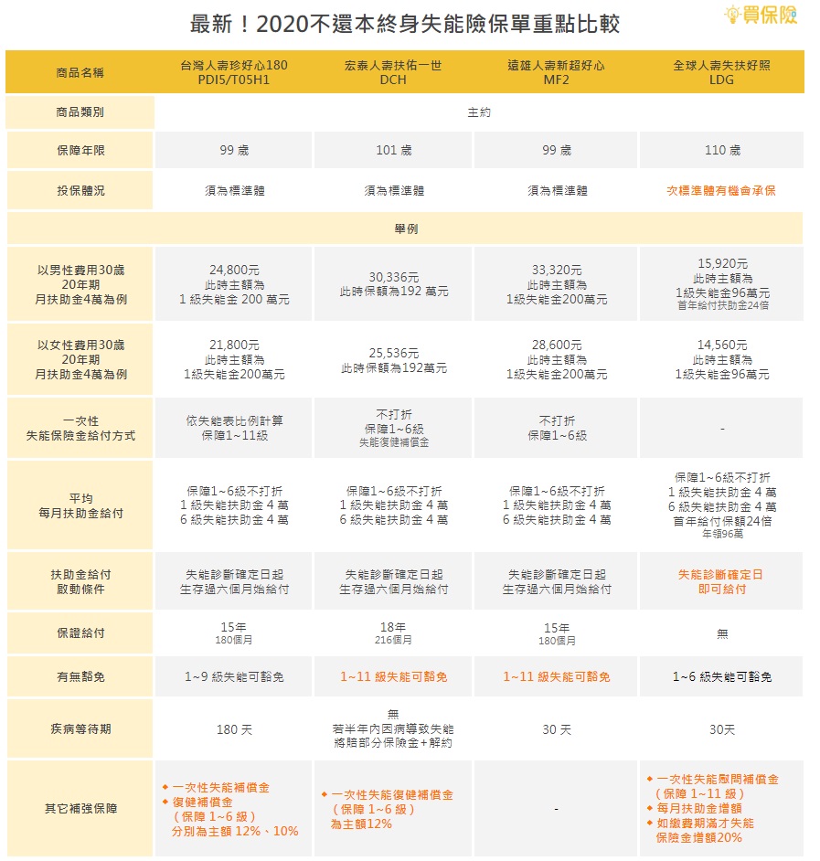最新!不還本終身失能險保單重點比較(2020.05新增宏泰DCH扶佑一世)