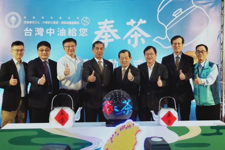 台灣中油響應行政院環保署「全民綠色生活政策」,以實際行動加入奉茶行列,成為第一個支持奉茶行動的國營企業;董事長歐嘉瑞(右4)、總經理李順欽(左4)及各界受邀貴賓,27日在中油大樓一樓共同進行「台灣中油給您奉茶」啟動儀式。