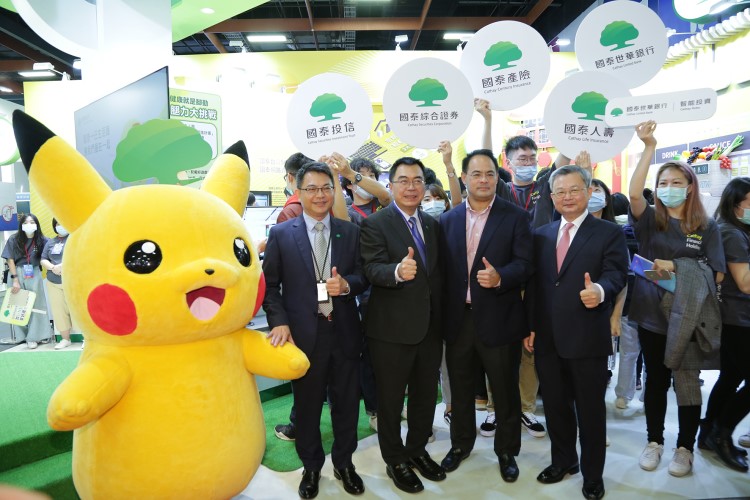圖片說明:國泰金控於2020台北金融博覽會展出「國泰一日生活圈」,左起國泰產險資深副總許嘉元、國泰投信總經理張雍川、國泰金控資深副總孫至德及國泰證券董事長莊順裕於攤位與皮卡丘合影。(國泰金控/提供)