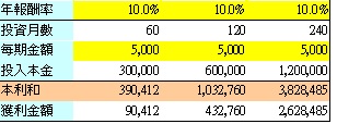 從以下試算表可以知道,如果每個月投資5000元,投資5年,年報酬率10%(假設),僅能獲利9萬元,但若持續投資10年,獲利卻可成長至43萬元,這就是本金變大、持續利滾利的複利效果。而如果可以持續投資20年,財富累積效果則更為驚人。
