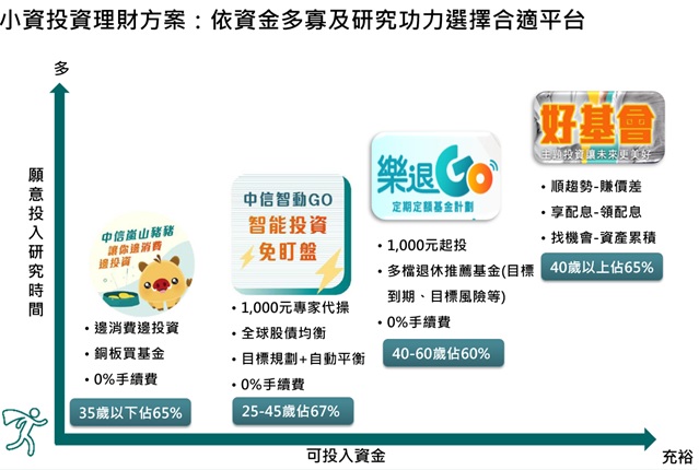 中國信託銀行舉例不同年齡、不同財富度或研究功力的投資人都有不同的投資方案可選擇,請參考下表。