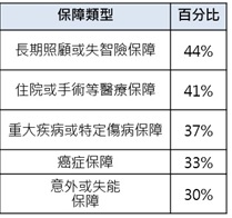 意的是,對於將來可能面臨的健康狀況問題,該如何準備相關保障,調查結果顯示,媽媽們認為自己最需要加強的保險保障為長照險或失智保障(44%),第二名是住院手術(41%),第三名為重大疾病或特定傷病保障(37%)、第四名為癌症(33%)、第五名則是意外或失能保障(30%)。而子女覺得媽媽需要規劃的前五大保險保障也是這五項。