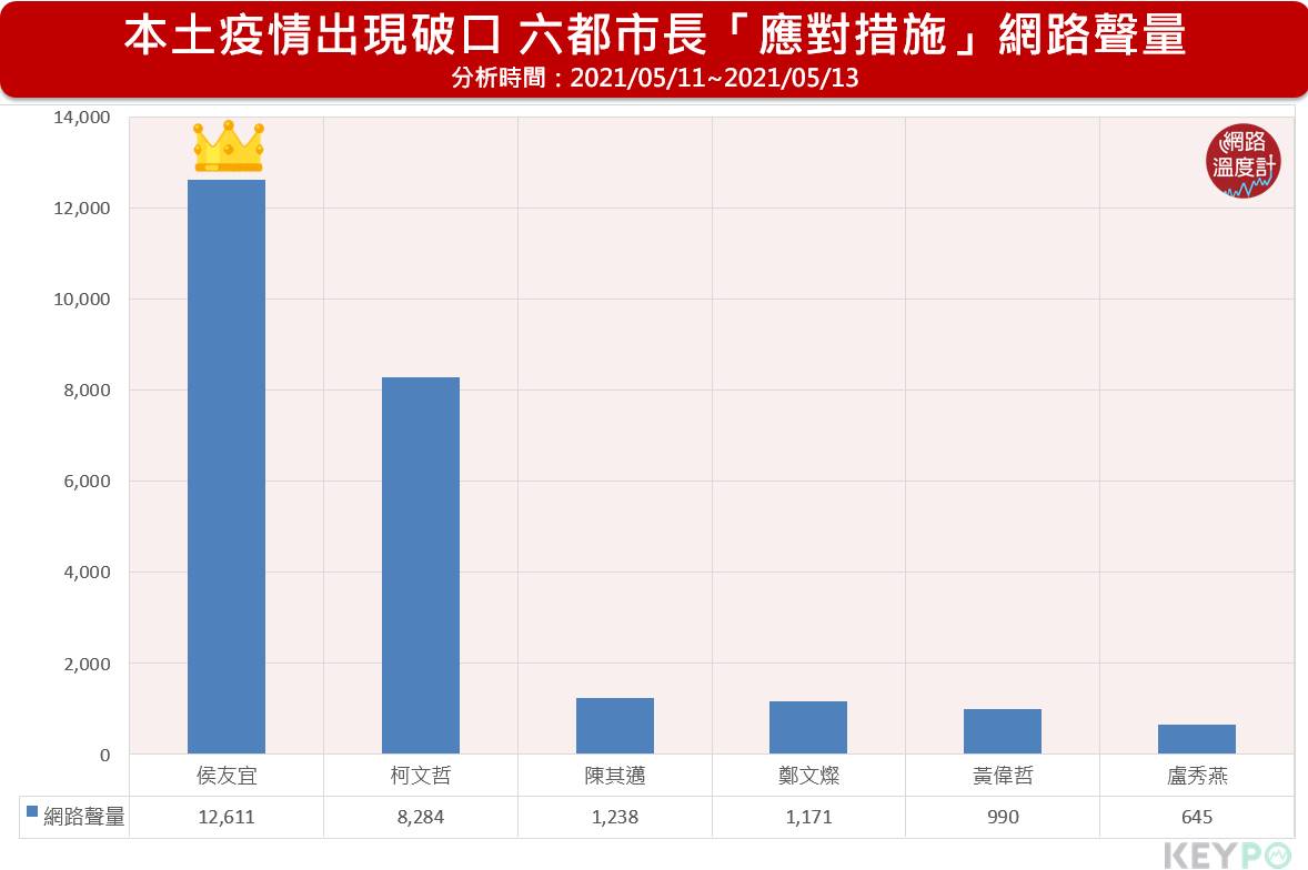 台灣本土疫情急遽升溫,11日爆出7例本土確診且其中6例為不明感染源,12日再爆增16例本土確診,指揮中心指揮官陳時中表示,目前還沒有升到第三級警戒,但各地政府紛紛「超前布署」加強防疫措施。透過《KEYPO大數據關鍵引擎》觀察,六都市長相繼在網路上宣布升級後的防疫措施,誰引起最高的網路迴響。