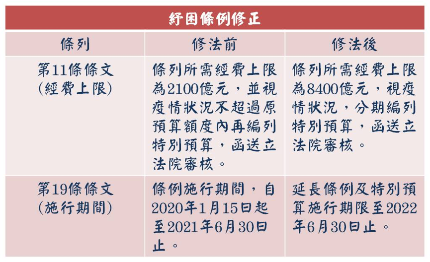 立法院今(31)日三讀通過《嚴重特殊傳染性肺炎防治及紓困振興特別條例》第11條及第19條條文修正案,提高紓困預算上限至8400億元,並將特別條例期限延長至明天6月30日。最快6月4日第一波的紓困金即可發放。