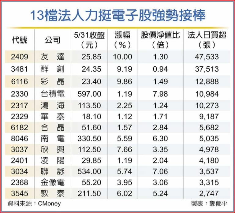 觀察法人動向,面板三虎友達、群創、彩晶31日分別獲三大法人買超47,533、37,513、12,888張,群創股價淨值比甚至不到一倍;其中,雙虎更榮登法人單日買超張數前兩大,法人買超前十大個股中,就有6檔電子股入列,傳產股則僅第一銅入榜,電子成法人新寵。台積電、鴻海、華泰、合晶、南電亦獲逾5千張買盤加持。