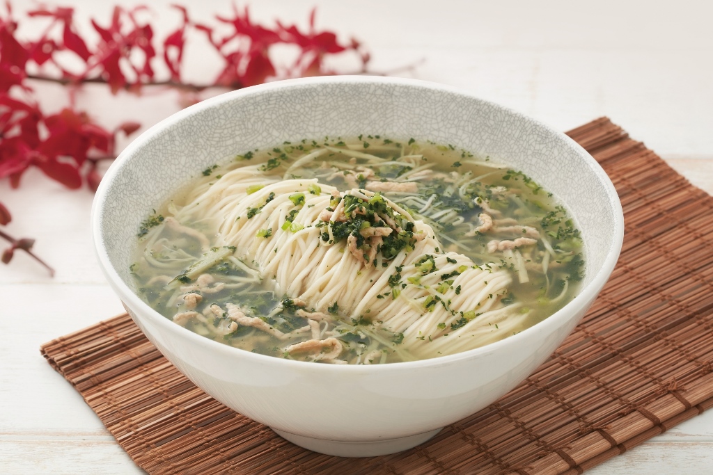 台北喜來登大飯店米其林二星餐廳請客樓的「雪菜肉絲麵」,將手工醃雪菜、上等豬里肌肉絲,搭配多種蔬菜及大骨熬煮的濃郁湯頭,入口清爽又富有層次感。