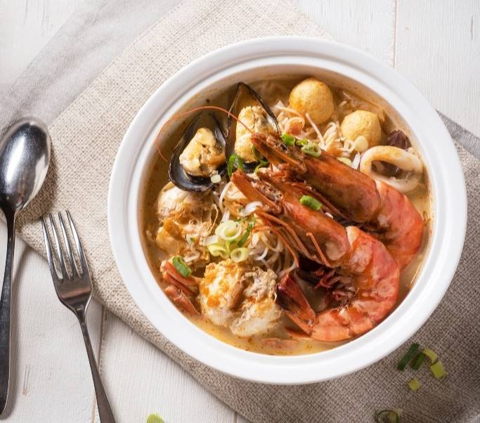 此次合作的7家飯店,跨越4大城市,包含台北、新北、新竹,甚至最遠到澎湖,每家飯店各推出一道經典料理,組合成「台灣五星飯店美食地圖包」,其中,台北六福萬怡酒店推出The Lounge大廳酒吧招牌料理「新加坡鮮蝦叻沙麵」,使用大量海鮮食材,並添加薑黃、香茅與多種辛香料手工慢火熬製出濃郁湯頭,再加入椰奶使其味道柔和,搭配手掌大草蝦、整隻螃蟹、小卷、淡菜、魚蛋點綴其中,鹹香微辣濃郁又開胃,最適合炎炎夏日品嚐,一口來到南洋。
