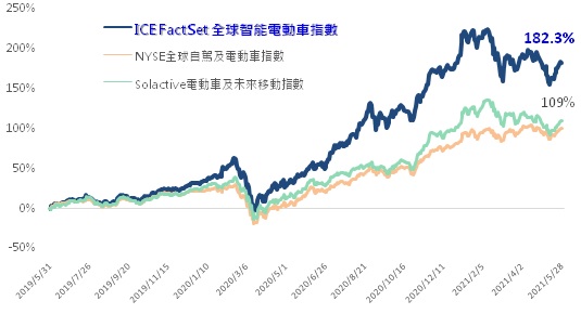 近2年,國際三大電動車指數中,「純」電動車指數(ICE FactSet)大勝!