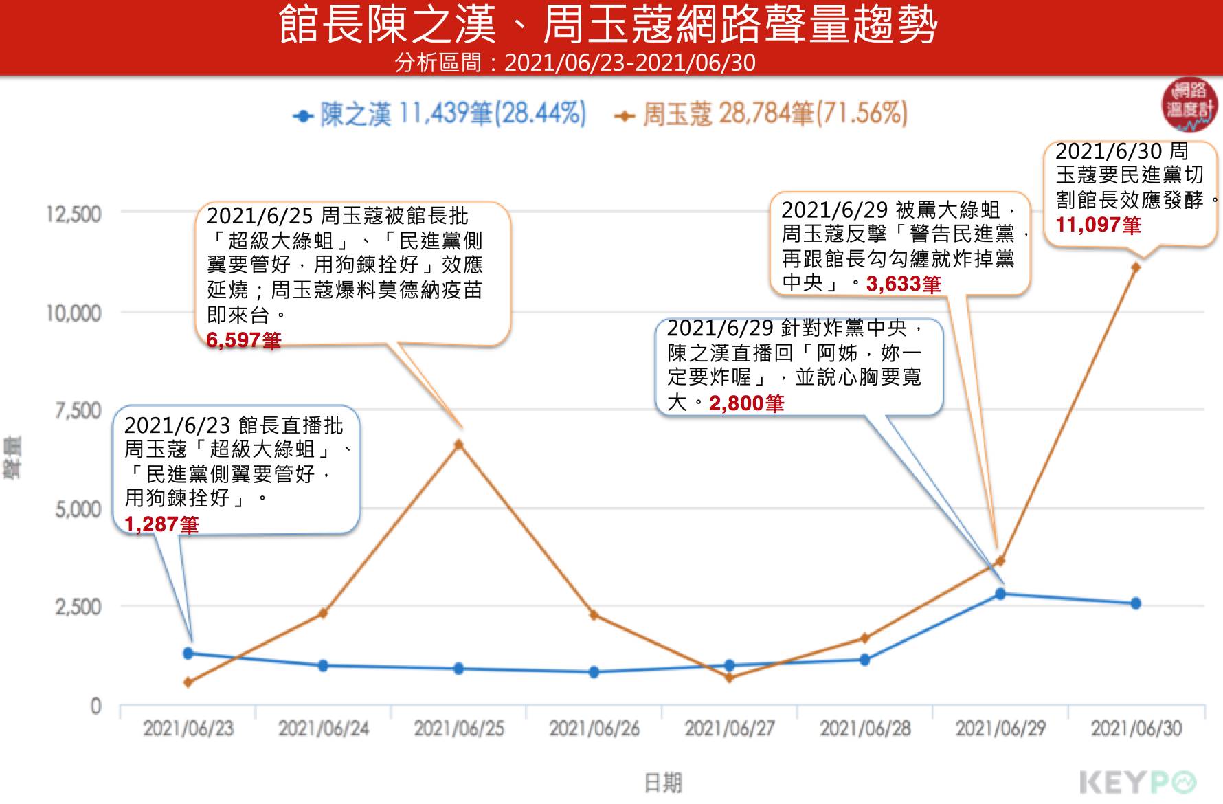 不滿自己被點名的館長陳之漢,6月23號晚間開直播,一開頭就說「這位女士,我2018年就跟她戰過,但當時她沒什麼流量,因為她是超級大綠蛆,超級大綠共,綠到爆炸,主持節目聲量不紅,就歸到黨意裡面,而且她是真民進黨打手」,措辭相當辛辣,該直播觀看數超過7萬多人次,不過,當天館長的網路聲量並沒有一次拉抬起來,反而是接下來連續兩天網路上持續發酵,助攻周玉蔻在6月25日的網路聲量衝到一波高峰,共有6,597筆。