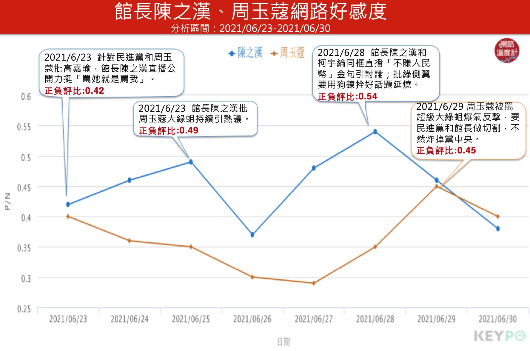 從網路聲量來看,周玉蔻的討論度高,甚至贏了粉專數高達149萬位追蹤者的館長陳之漢,但從<KEYPO大數據關鍵引擎>(2021/06/23~2021/06/30)網路好感度調查來看,兩人比數則是相反,「大綠蛆」事件延燒好幾天,6月25號周玉蔻聲量是增加了,但好感度上則是由館長陳之漢奪下,到了6月29日兩人同一天先後開直播隔空對嗆,網路好感度評比稍微拉近,隔天30日周玉蔻開始呈現微幅領先。