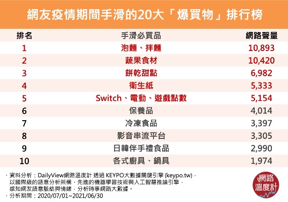 不少網友都趁著居家期間,仔細審視屋內每個角落、發展興趣愛好,動手添購許多物品,好好投資在自己和家中的每一處!今天<Daily View網路溫度計>透過<kEYPO大數據關鍵引擎>調查了網友們疫情期間都手滑買了些什麼?快來看看自己買的東西是不是也在其中吧!