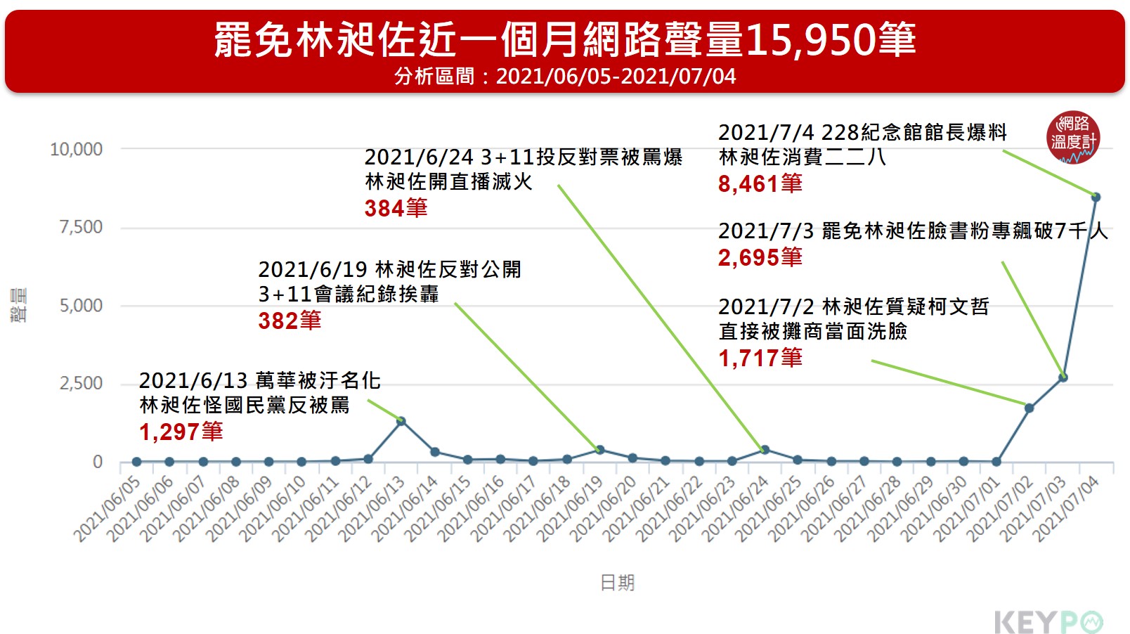 因為這場「洗臉」風波,拉抬了罷免林昶佐的網路聲量,截至5日為止,不僅創立不到1個月的《罷免林昶佐》臉書粉絲專頁按讚數暴漲至2.8萬,《Daily View網路溫度計》透過《KEYPO大數據關鍵引擎》調查近一個月的聲量數據(分析期間:2021/06/05-2021/07/04),罷免林昶佐的聲浪逐漸擴大,尤其2日之後更是急遽攀升,對林昶佐的殺傷力可見一斑。