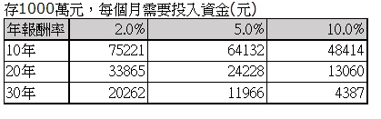 另外,提高報酬率也可讓理財更輕鬆,假設投資20年,年投資報酬率從5%提高到10%,每月投資金額就可從24000元降為13000元。所以,越早開始投資越好,同時要選擇高報酬率的理財工具。