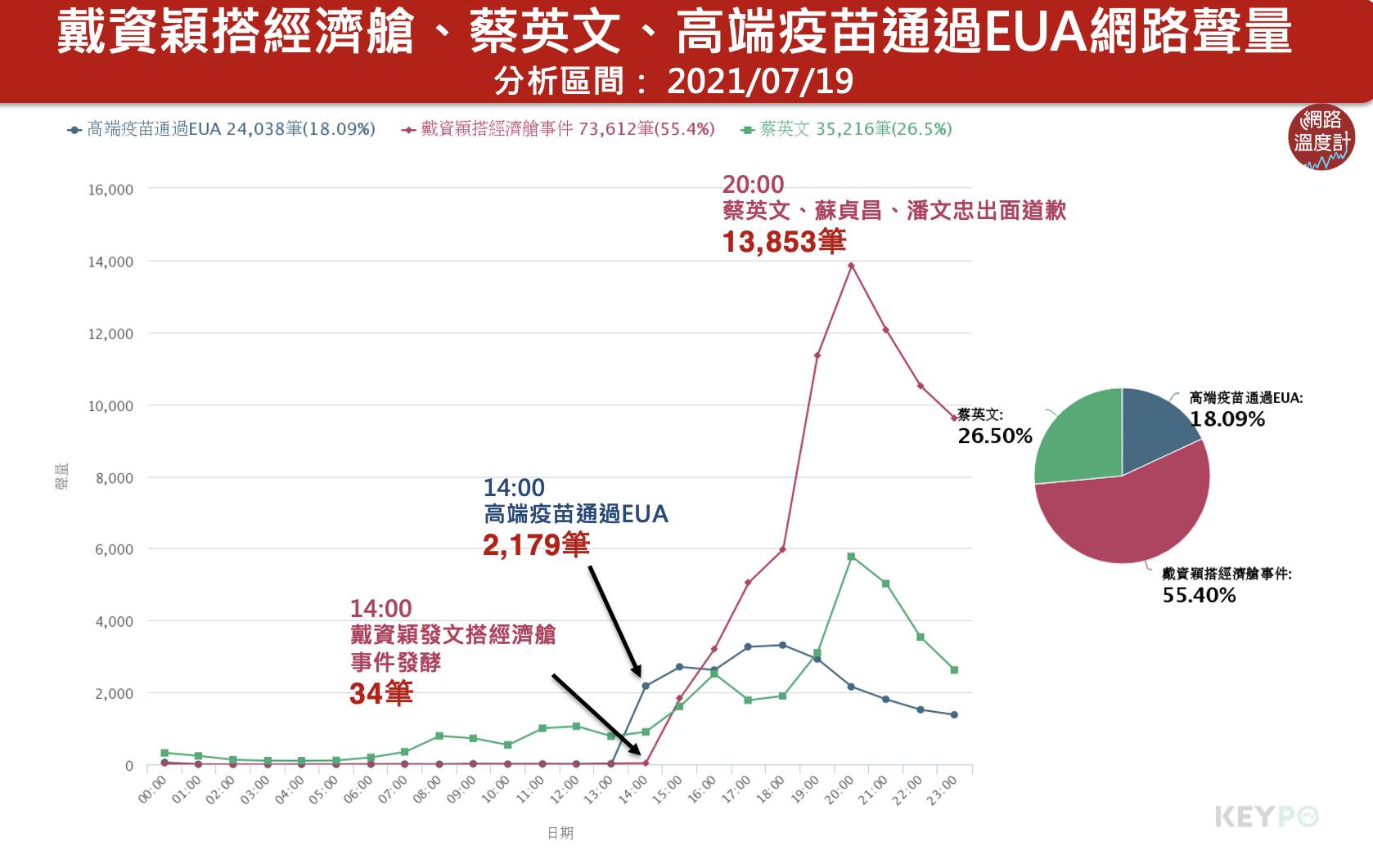 但疫情記者會才剛結束,高端話題正在發酵「戴資穎搭經濟艙」事件馬上爆發,戴資穎約在中午於限時動態打卡「好懷念長榮航空,可以搭商務艙」後,下午2點開始有網路關注,後續戴資穎3點發出飯店、便當照片,再次造成網友熱論「為台灣選手感到可悲」、「安排個座位都可以出錯,是幹什麼吃的= =」、「蔡英文好像什麼都管不到呢」、「看好了世界,世界球后,經濟艙」等,於傍晚4點超越「高端疫苗通過EUA新聞」戴成為當日話題人物。