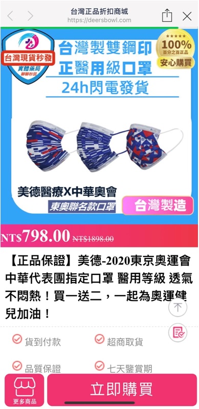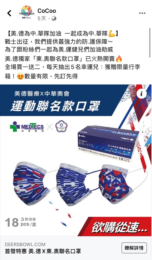 臺北市政府法務局今(21)日發布消費警訊指出,東京奧運議題正熱,惟網路出現「一頁式網頁」販售中華奧會運動聯名款醫用口罩,經北市府消保官向美德醫療公司查證,證實網頁係盜用官方臉書專頁圖文,消保官已通報法務部調查局,提醒民眾多加留意。