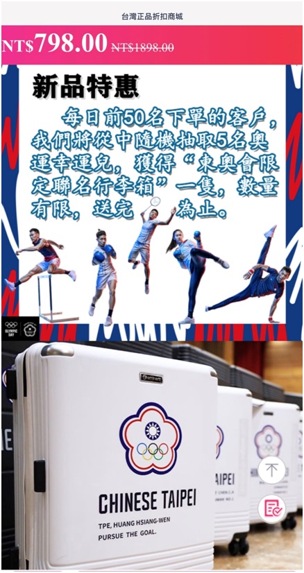 法務局指出,該一頁式網頁以下單即抽「東奧中華隊行李箱」等行銷手法,吸引民眾下單購買,惟查該等行李箱實未經中華奧會授權,提醒民眾切勿受騙。消保官提醒,近來「一頁式廣告」詐騙業者已遍及臉書、IG、LINE、入口網站或社群媒體,業者常搭上熱門時事或熱銷商品,購買廣告推播商品,以吸引民眾購買,並強調貨到付款、享7日猶豫期等,降低民眾戒心。