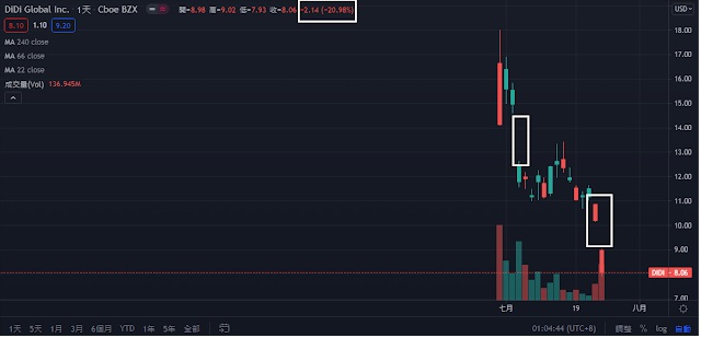 上圖為滴滴打車日線圖,可看到掛牌上市後不斷大跌,上週五也跌了21%。中國科技巨擘最近陸續遭遇北京監管重拳,阿里巴巴(代號:BABA) 4月被罰28億美元破紀錄罰款,子公司螞蟻集團赴美上市計畫臨時喊卡,並且整頓為金融控股公司。也讓阿里巴巴(代號:BABA)的股價受到影響,今年以來還下跌了11.3%,中國科技業蓬勃發展,各項服務深入消費者日常生活,北京當局這時候出手抑制他們的影響力,觸角甚至延伸到數據安全,未來金融主管機關也準備改變規定,禁止中企赴美上市(IPO)。這些事情都讓中概股受到極大的賣壓,不過美股市場倒是一片欣欣向榮,沒有太大的影響。