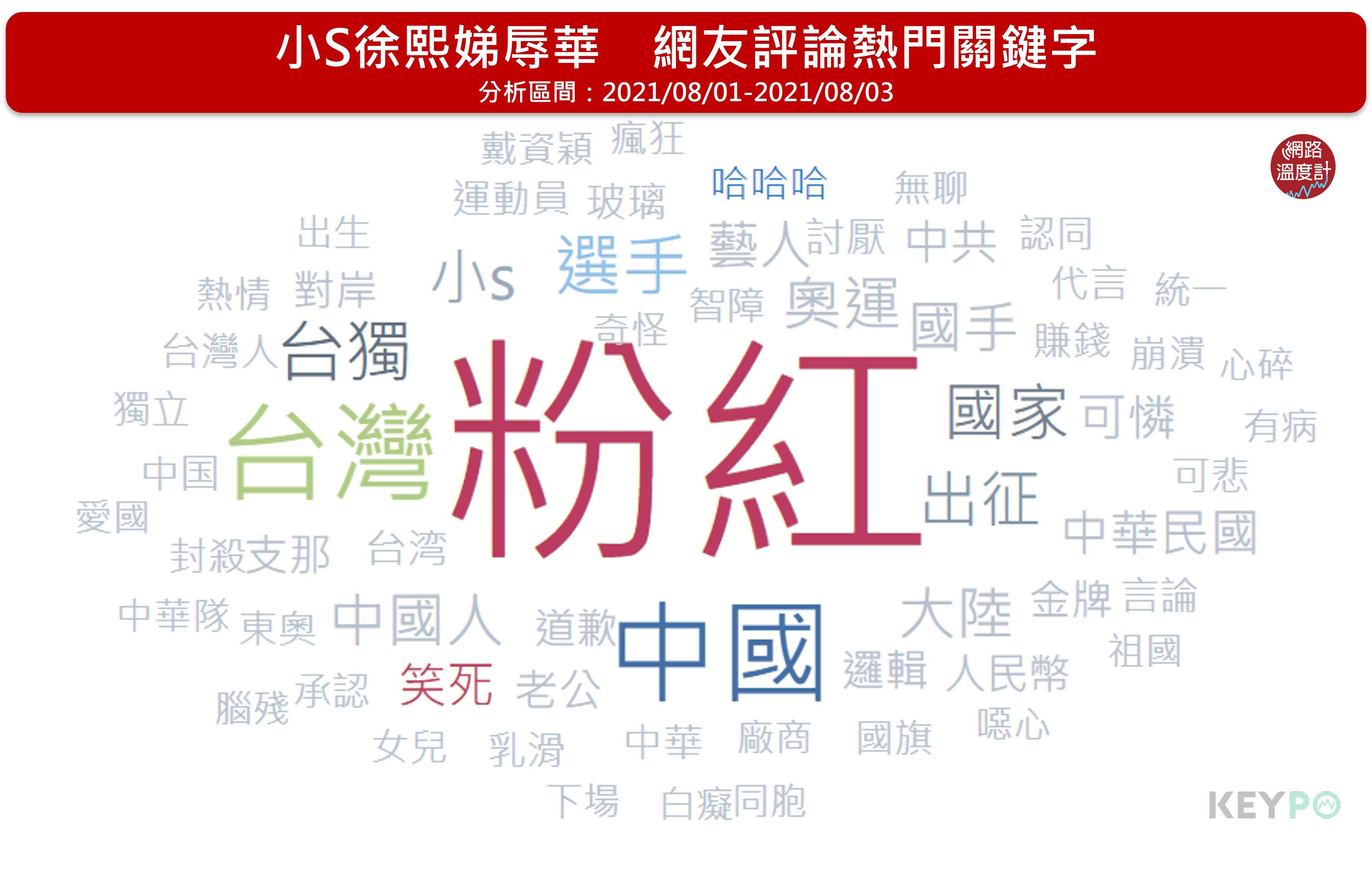 《DailyView網路溫度計》透過《KEYPO大數據關鍵引擎》針對78,640則留言分析,發現對小S本人的喜惡評論不多,「笑死」、「哈哈哈」、「無聊」、「可悲」、「可憐」都是針對中國網友出征行為進行反擊,認為對方非常「玻璃」,甚至有「噁心」、「腦殘」、「智障」、「支那」、「有病」等極具攻擊性的詞彙大量出現,反中情結昭然若揭。