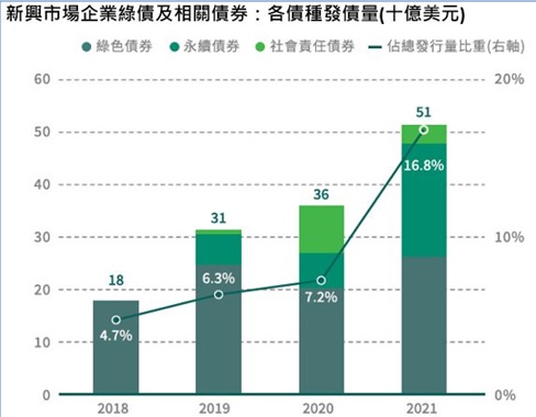 劉書銘指出,隨著今年下半年QE退場訊息浮現,也建議投資人適合採取長線資金進場的策略,趁勢布局新興市場企業債,進一步納入有ESG評級的債券題材,有助累積資產未來的成長空間。