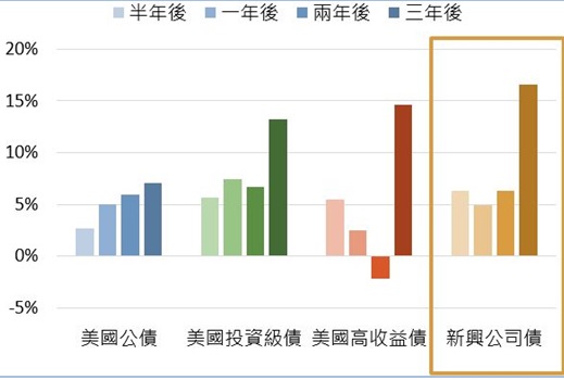 資料來源:Bloomberg。美國公債、美國投資級債、美國高收益債皆為Bloomberg Barclays債券指數,新興企業債為JPM新興市場企業債券指數。*依照狀圖顏色深淺表達不同期間報酬。資料日期:2010/12 – 2016/12。