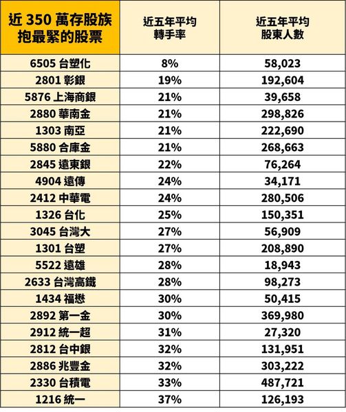 如果參考轉手率40%以下且股東人數大於5萬這個基準來看,過去 1年擁有最多存股族的類股莫過於電信、塑化與金融,其中個股分別是6505台塑化、2801彰銀、5876上海商銀、2880華南金、1303 南亞、5880 合庫金、2845 遠東銀、電信三雄等等⋯⋯這些人數相加就達約 350 萬人次。