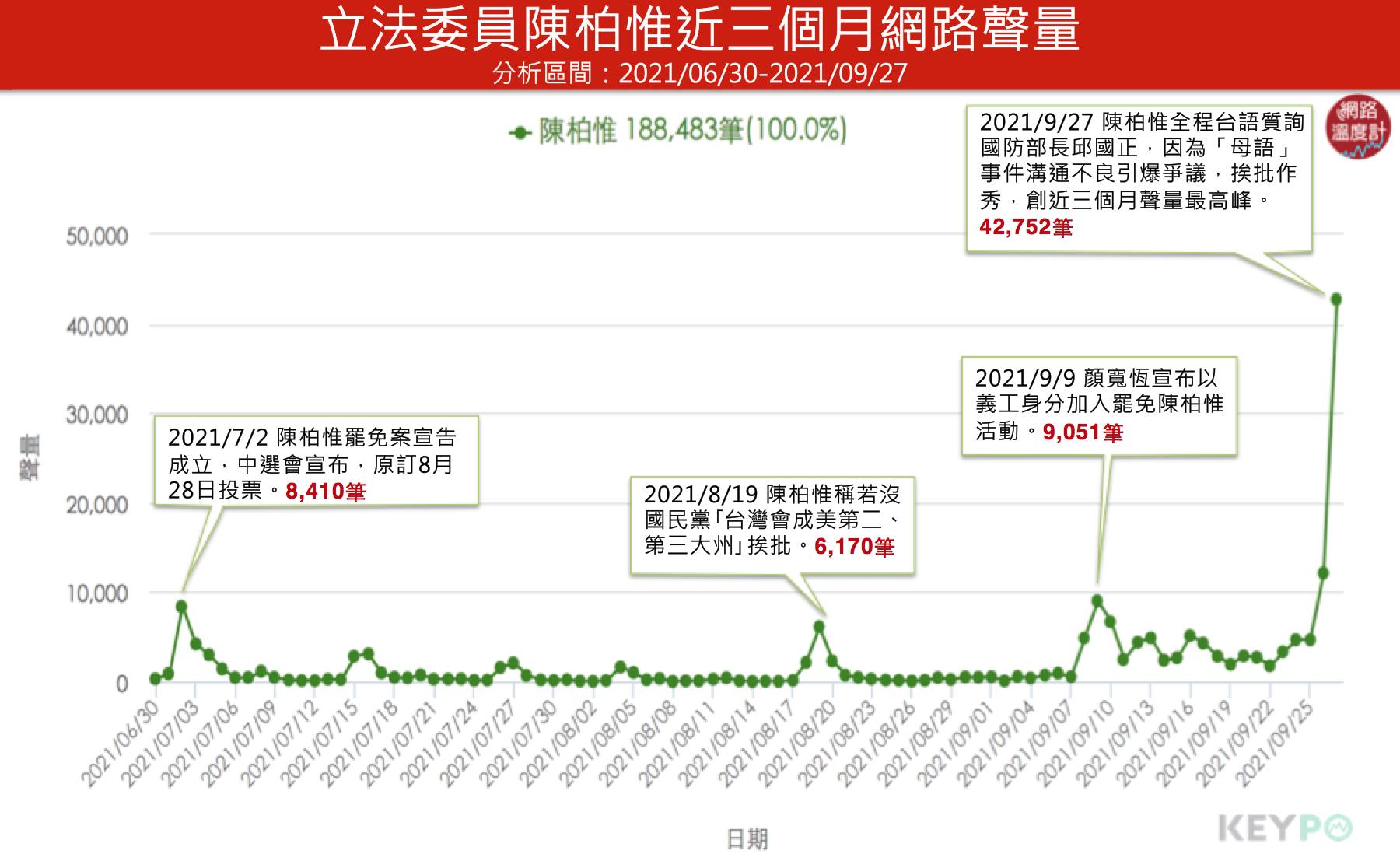 根據《KEYPO大數據關鍵引擎》(2021/06/30~2021/09/27)所做的統計調查,陳柏惟「母語」質詢事件,創下他個人近三個月網路聲量最高峰,單日討論數多達42,752筆,遠遠高過於第二名9,051筆的「顏寬恒宣布以義工身分加入罷免陳柏惟活動」,而聲量第三高落則是在7月2日中選會宣布「陳柏惟罷免案成立」,有8,410筆。