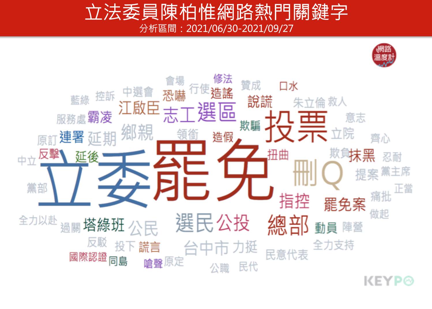 透過《KEYPO大數據關鍵引擎》(2021/06/30~2021/09/27)分析發現,網路上陳柏惟的熱門關鍵字除了罷免案相關「罷免、公投、刪Q」之外,負面字詞同樣不少,包括「霸凌、恐嚇、造謠、指控、謊言、扭曲、抹黑」等,顯見過去這段時間,網路搜尋陳柏維相關資料,負面字詞、爭議言論恐怕不在少數。罷免案倒數計時,「3Q哥」是否會被消失變成「刪Q哥」,如何把高聲量轉變成高支持度,陳柏惟恐怕要好好思考要一下。