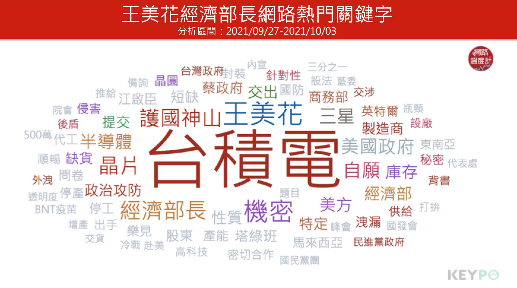 進一步透過<KEYPO大數據關鍵引擎>(2021/09/27~2021/10/03)觀察分析,王美花近一週內的熱門網路關鍵字和台積電事件有非常大的關聯性,包括「機密、祕密、侵害、洩漏、政治攻防」等字詞都在熱搜名單中。前一陣子,台灣疫苗數量不足,台積電和鴻海、慈濟聯手幫政府到國際市場上搶購疫苗,近期內這批BNT疫苗已分批運抵台灣,如今,台積電遇到這般棘手狀況,政府能否也當廠商背後最強、最有力的後盾?就看經濟部如何交涉、居中協調。