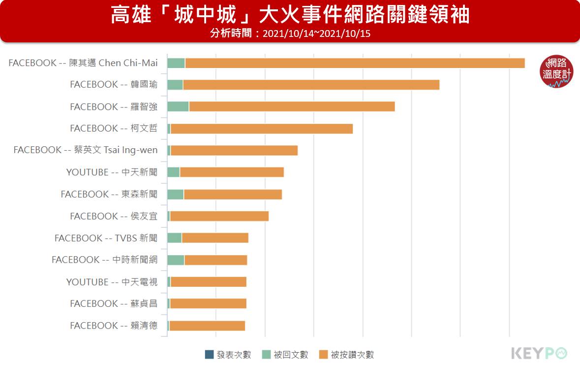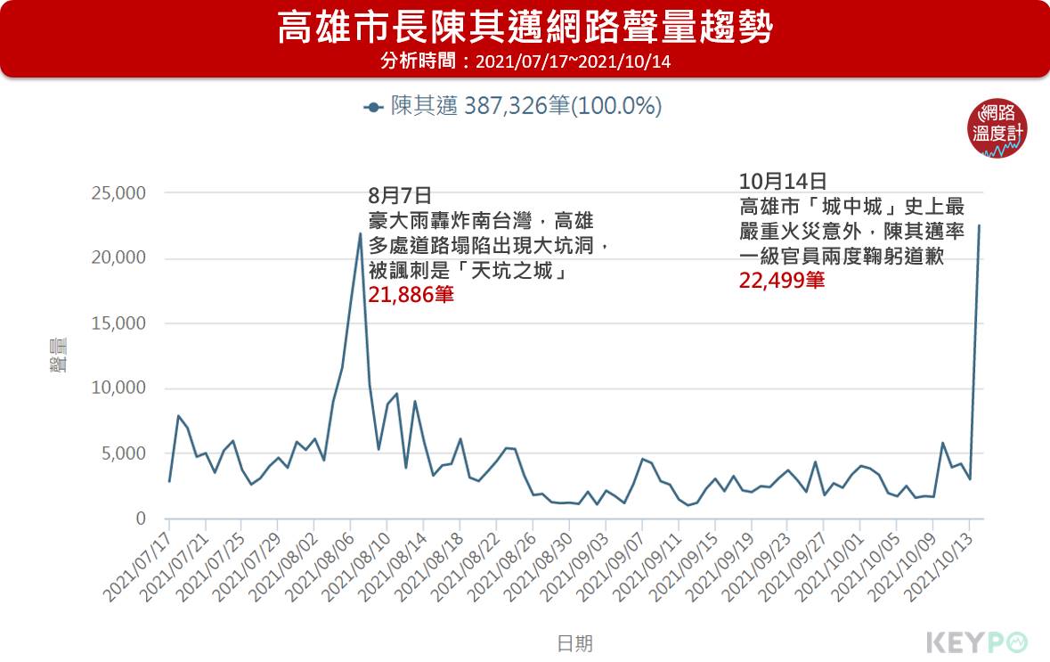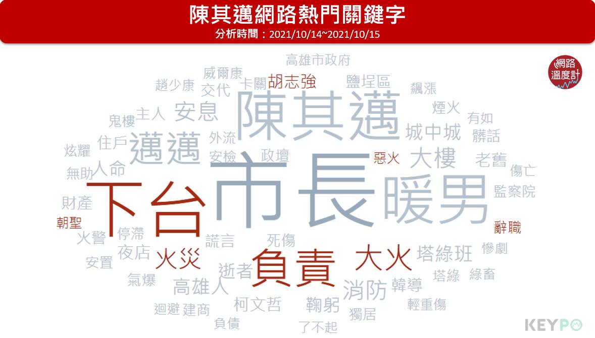 透過《KEYPO大數據關鍵引擎》調查,面對高雄史上最嚴重的火災事故,已就任滿周年的高雄市長陳其邁難辭其咎,事件發生後網路聲量快速拉升至22,499筆。陳其邁第一時間在臉書致上最沉重的道歉,並表示「我們絕對不會迴避責任問題」,承諾全力調查火災事故真相、成立行政調查小組、全面檢討現行消防建管法規制度,態度獲得不少網友肯定,紛紛留言加油打氣「市長及市府團隊辛苦了」、「市長加油」,但也有網友認為「總是發生重大傷亡才來檢討,消防安檢本來就是要做的」、「鞠躬道歉就沒事了嗎?誰該負責,你的責任最大,局處首長都是你任命的」。