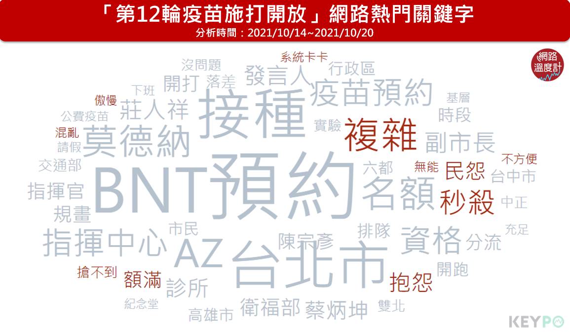被許多網友稱為「史上最複雜」的第12輪疫苗開放施打,這次同時開放登記BNT、AZ、莫德納等疫苗,數量也是疫苗開打以來最多的一次,衍生出不少亂象。其中,台北市疫苗施打量能與中央開放名額不同調,頻頻隔空互嗆,以及將AZ疫苗集中花博接種,也招致不少罵聲。透過《KEYPO大數據關鍵引擎》調查熱門關鍵字,第12輪疫苗開放施打出現「複雜」、「秒殺」、「搶不到」等負面字詞,且網友最不滿名額一開放就被秒殺的情況。