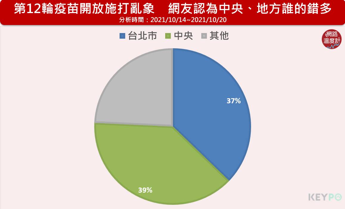 面對疫苗施打亂象,中央、地方相互指責是對方的問題,但從網友角度來看認為是誰的錯,透過聲量調查批評聲浪中,有37%在罵台北市、39%罵的是中央與指揮中心,雙方差距並不大。