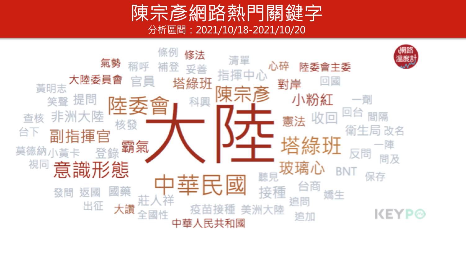 進一步透過<KEYPO大數據關鍵引擎>熱門關鍵字觀察分析,「大陸」一詞登上陳宗彥熱搜字第一名,另外像是霸氣、意識形態、塔綠班、陸委會主委、小粉紅、玻璃心、心碎等字詞也都在榜單之中。