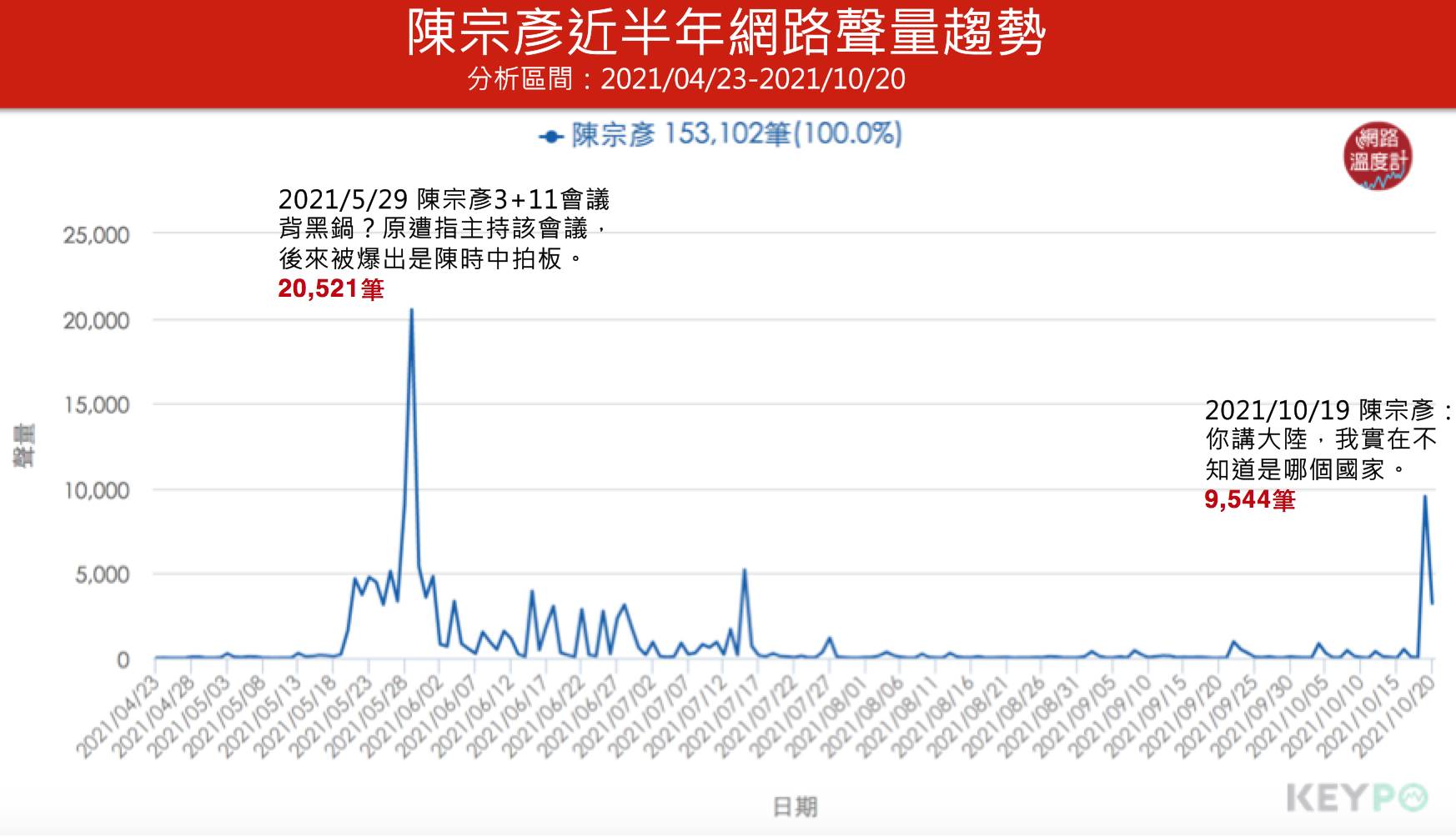 「我不知道大陸是哪個國家」這番說法,立刻助攻陳宗彥個人網路聲量,根據<KEYPO大數據關鍵引擎>(2021/04/23~2021/10/20)統計調查,陳宗彥19日當天網路聲量衝上9,544筆,是半年來第二高峰,僅次於5月份的「3+11」背黑鍋事件。過去半年裡的每日的例行記者會上,陳宗彥幾乎不會是聲量最高、討論度最高,或是最搶眼的那一位,但19日記者會上的這番回應,「濃濃政治味」讓藍綠支持者網友掀起一股熱議。