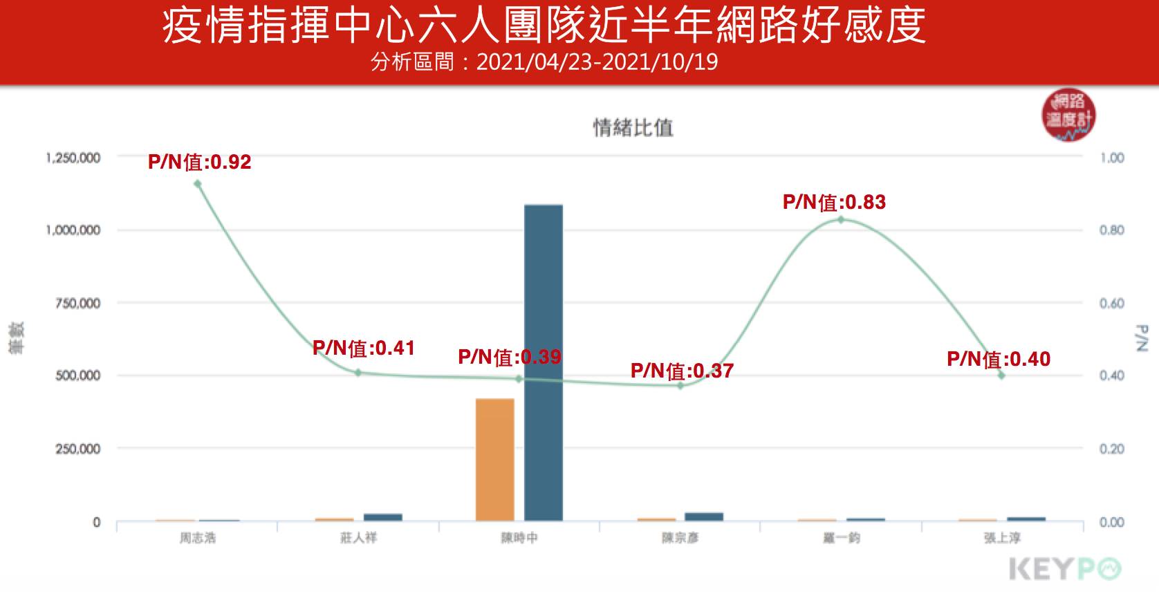 另外,討論度最高,聲量最高的陳時中,好感度排名則是位居第五,相較於去年的防疫成效,讓他被拱出征台北市長呼聲極高,連帶也是民進黨內看好的一顆政治新星,但今年疫苗採購事件、3+11破口等等事件,讓他好感度大受影響。至於最後一名就是近日發言政治味十足的副指揮官陳宗彥,「不知大陸是哪個國家」一句話,讓他成為熱議焦點,正負評價也同時湧入。