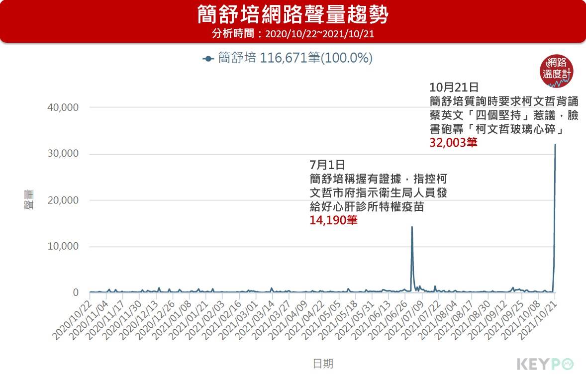 透過《KEYPO大數據關鍵引擎》調查(2020/10/22~2021/10/21),民進黨發言人、台北市議員簡舒培兩次聲量高峰都來自砲打台北市政府,先是好心肝診所特權疫苗事件發生後,7月1日簡舒培在臉書稱自己握有證據,指控柯文哲、黃珊珊早就知情,事發後卻甩鍋給基層,黃珊珊隨即貼出LINE對話紀錄自清,不過後續調查報告顯示黃珊珊未指示衛生局或任何人,事情才告一段落。