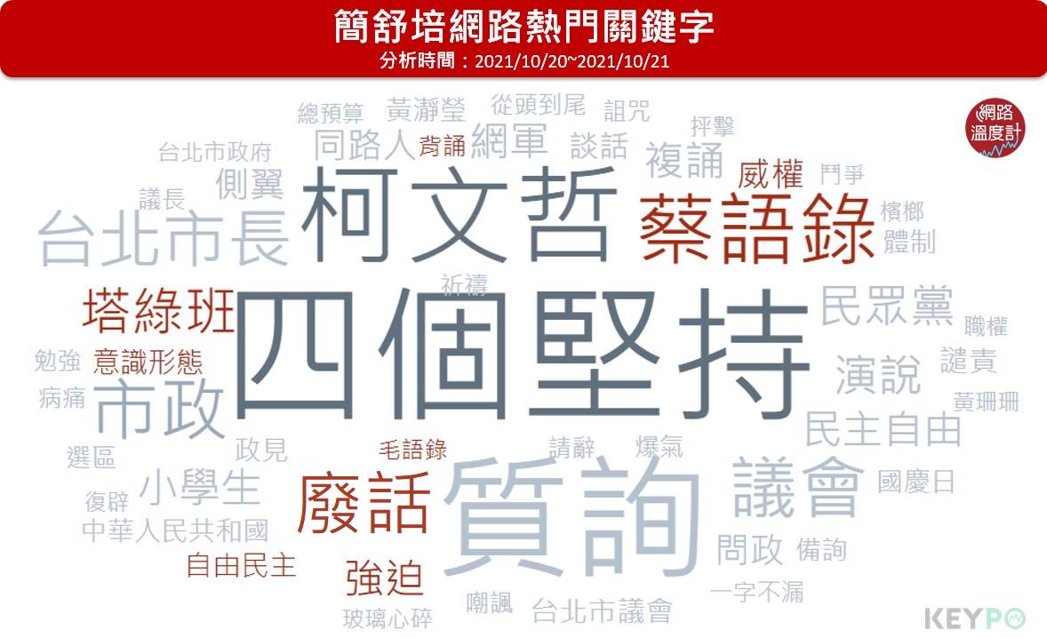 觀察熱門關鍵字包括「蔡語錄」、「塔綠斑」、「意識形態」、「威權」、「自由民主」等都上榜,不少網友認為這樣的問政表現不及格,批評是把質詢時間當成操控意識形態的個人秀,並拿毛語錄類比,諷刺要求背誦「四個堅持」的行為,猶如民進黨版本的「蔡語錄」,簡舒培臉書因此遭灌爆「議會問這種問題根本亂七八糟」、「請問您昨天的問政和台北市政有任何關係嗎」、「改天要不要出個英語錄,台灣人民出門要先唸四個堅持」。