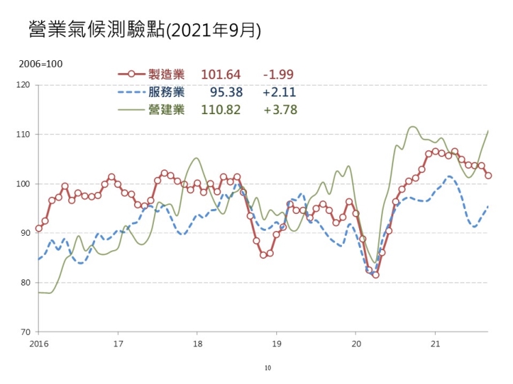 根據本院調查結果,經過模型試算後,9月服務業與營建業營業氣候測驗點上揚,製造業測驗點則呈現連續五個月下滑態勢。