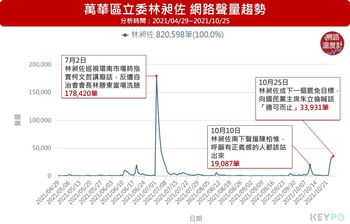 透過《KEYPO大數據關鍵引擎》調查(2021/04/29~2021/10/25),林昶佐聲量最高峰出現在7月2日巡視環南市場,網路聲量共計17萬8420筆。原先是中央與地方一同視察的行程,林昶佐身為中正萬華區地方立委也現身其中,但卻被認為沒有幫萬華人說話,還站在衛福部長陳時中身旁,砲轟台北市長柯文哲只會講廢話、慢半拍,遭一旁聽不下去的自治會長林勝東洗臉「你也沒來過,只會給人吐槽」。