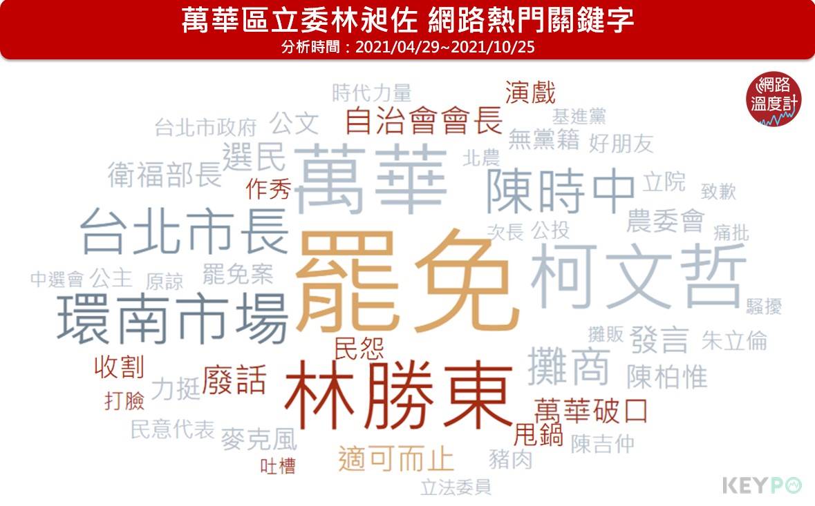 觀察熱門關鍵字,林昶佐因為環南市場事件引起民怨,挨轟「滾回去唱歌」、「要演戲去電視演」,網路熱門字詞「演戲」、「作秀」、「民怨」、「甩鍋」等都上榜。正面臨第二階段連署審查的林昶佐被認為是下一個罷免目標,隨著立委陳柏惟罷免案通過,《選罷法》下修爭議吵的沸沸揚揚,還被網友翻出林昶佐過去主張下修罷免門檻,如今卻向國民黨主席朱立倫喊話「適可而止」不要撕裂社會,挨酸「又在檢討別人」,也讓「適可而止」四個字上榜。