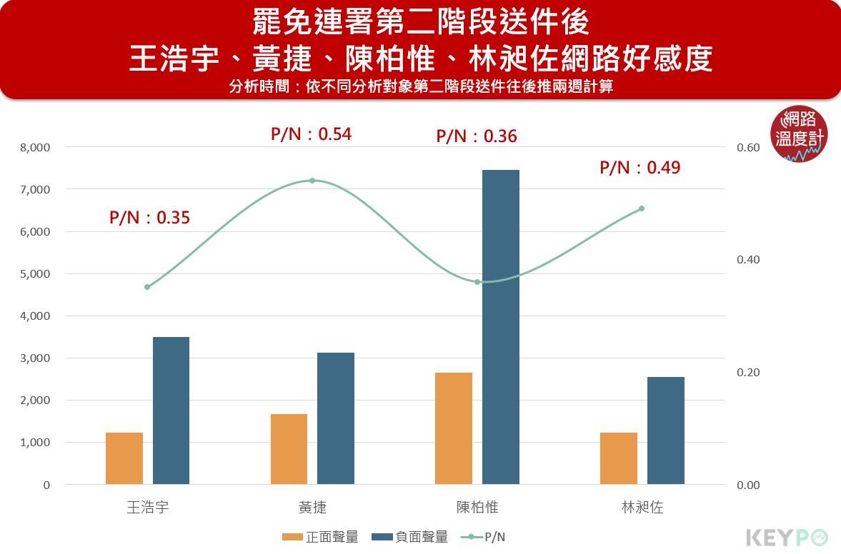 前高雄市長韓國瑜遭罷免後,罷免烽火四起,接續有桃園市議員王浩宇、高雄市議員黃捷、台中立委陳柏惟被鎖定罷免。觀察第二階段送件起兩週內的網路好感度,黃捷網路好感度(正負情緒比)P/N值0.54最高,其次為林昶佐P/N值0.49,高於外界認為是因為「嘴秋」,喜歡到處開戰場激起仇恨值,最終才會遭罷免成功的王浩宇、陳柏惟。