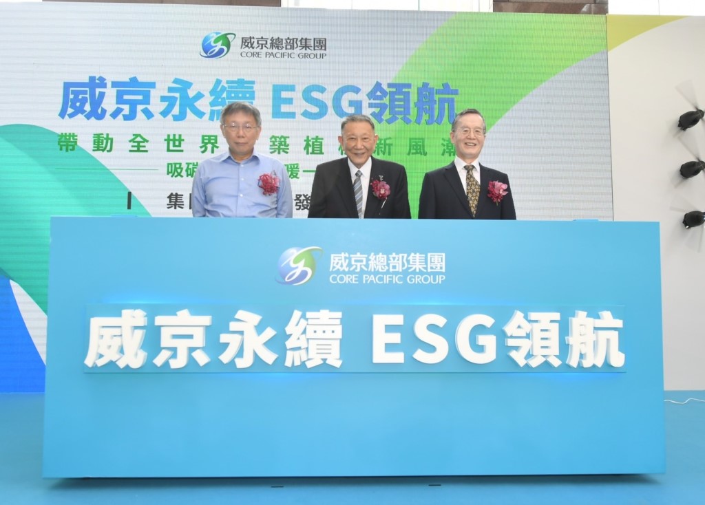 台北市長柯文哲(圖左1)、台灣永續能源研究基金會董事長簡又新(圖右1)、海基會董事長許勝雄、工商協進會理事長林伯豐、華南銀行董事長張雲鵬、台達電董事長海英俊…等工商金融界人士,應邀出席活動,並對威京總部集團在ESG中節能減碳、吸碳抗暖的決心,表示肯定。